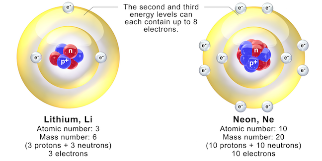 The outermost electrons determine how atoms can be bonded together. Elements with a full outer shell (e.g., neon, Figure below, to the right) are inert because they do not react with other elements to form compounds. These are the noble gases (including helium, argon, krypton, and radon, in addition to neon) in the far-right column of the periodic table. For elements that do not have a full outer shell (e.g., lithium, Figure below, on the left), the outermost electrons can interact with the outermost electrons of nearby atoms to create chemical bonds.