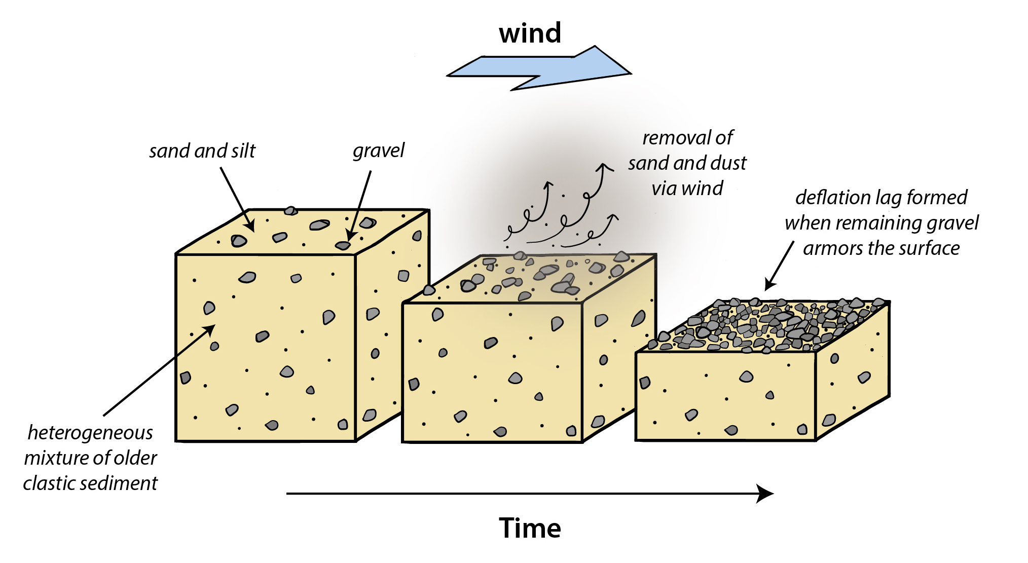 - Deflation lags (or desert pavements) - accumulations of gravel that form when finer sediment is winnowed away leaving a gravel-armored surface behind.